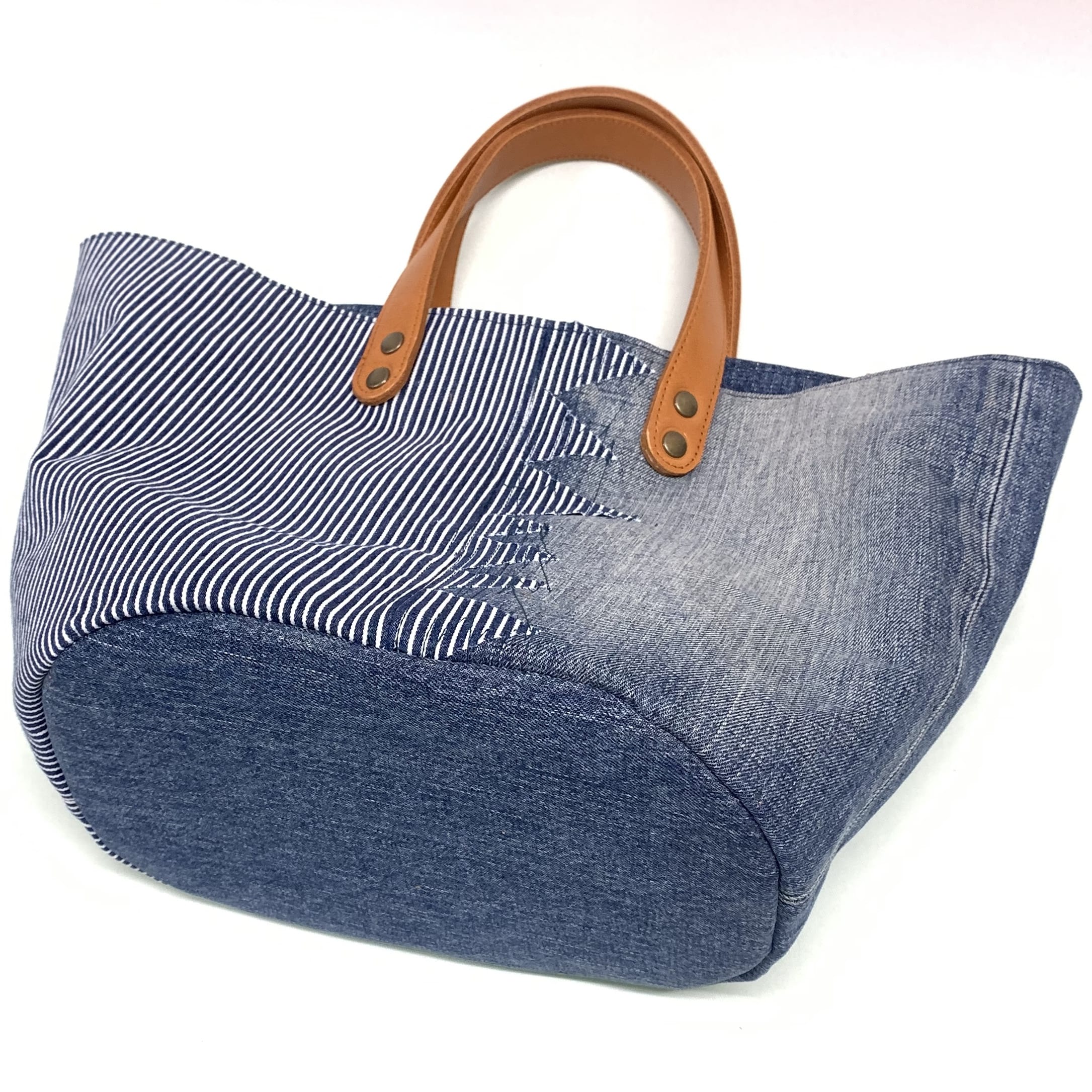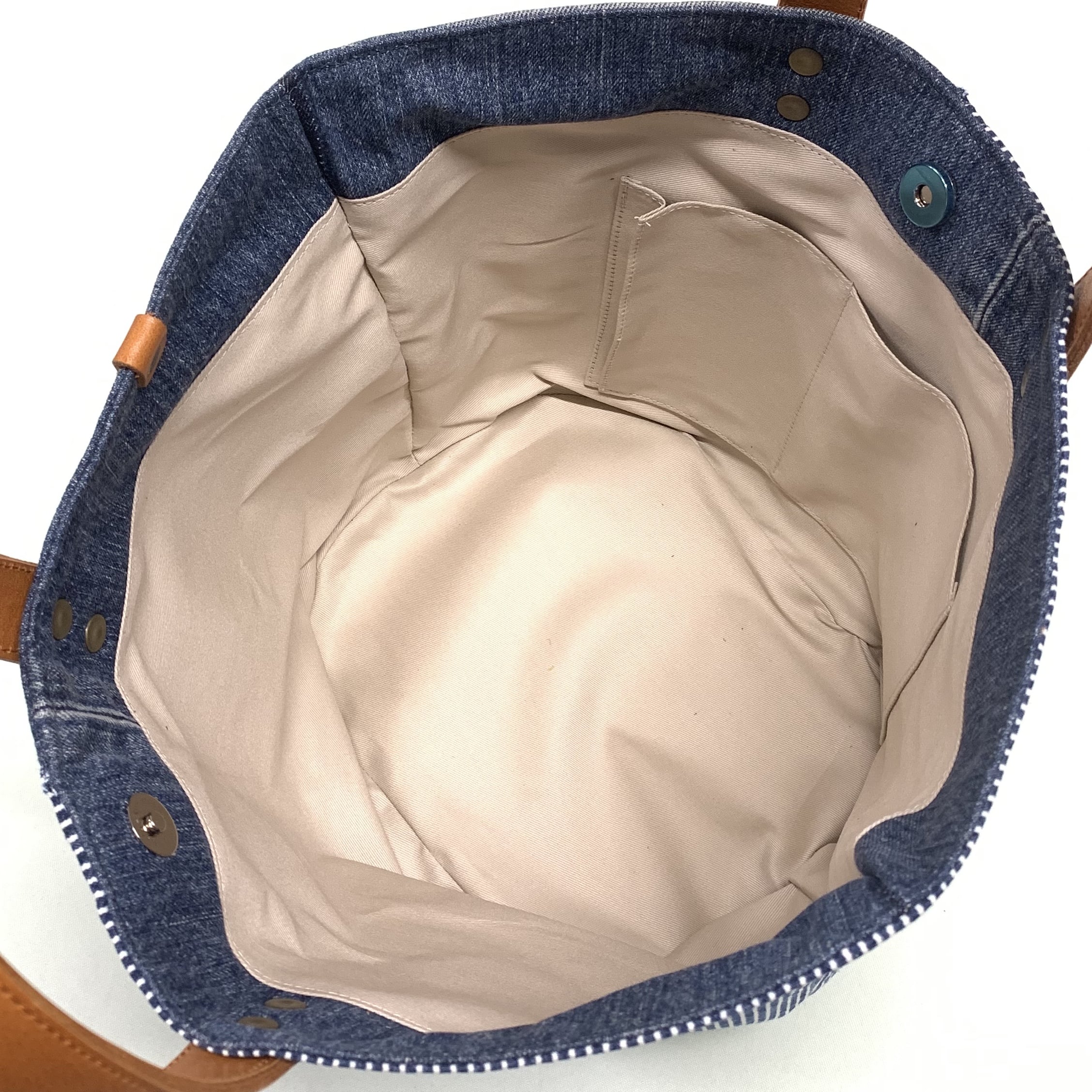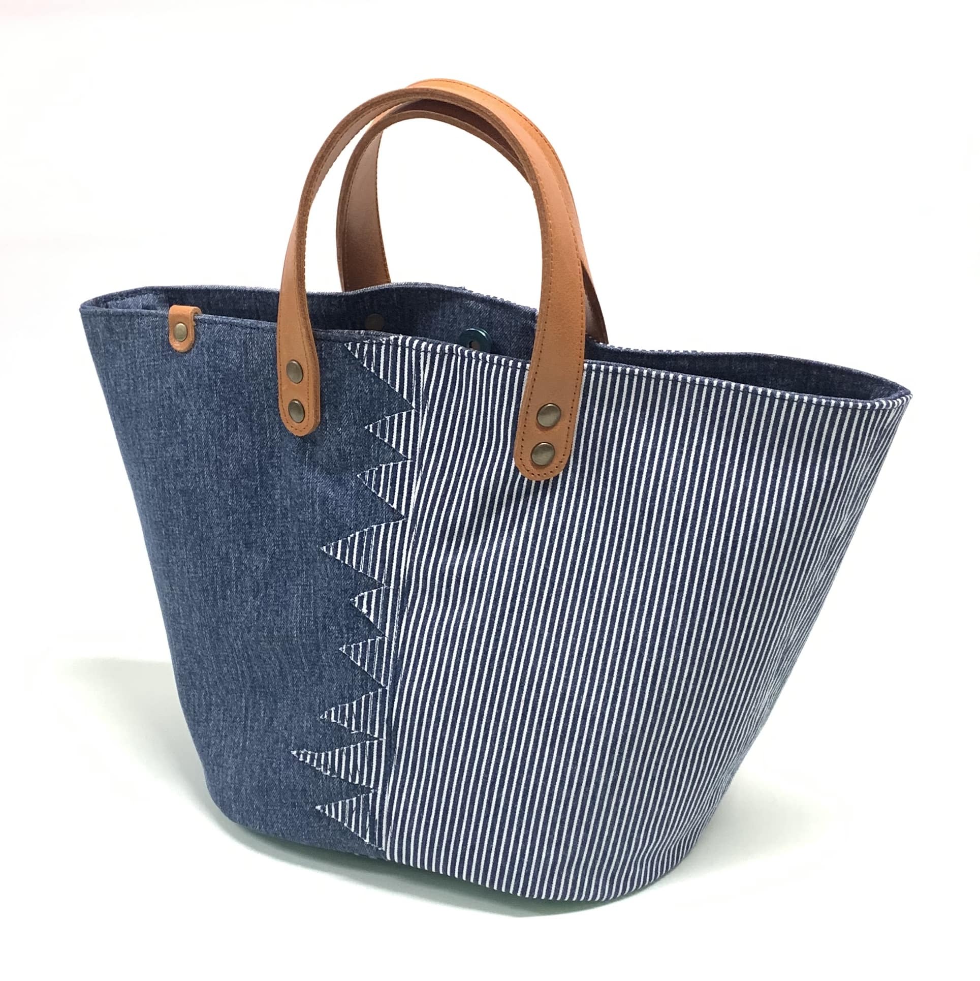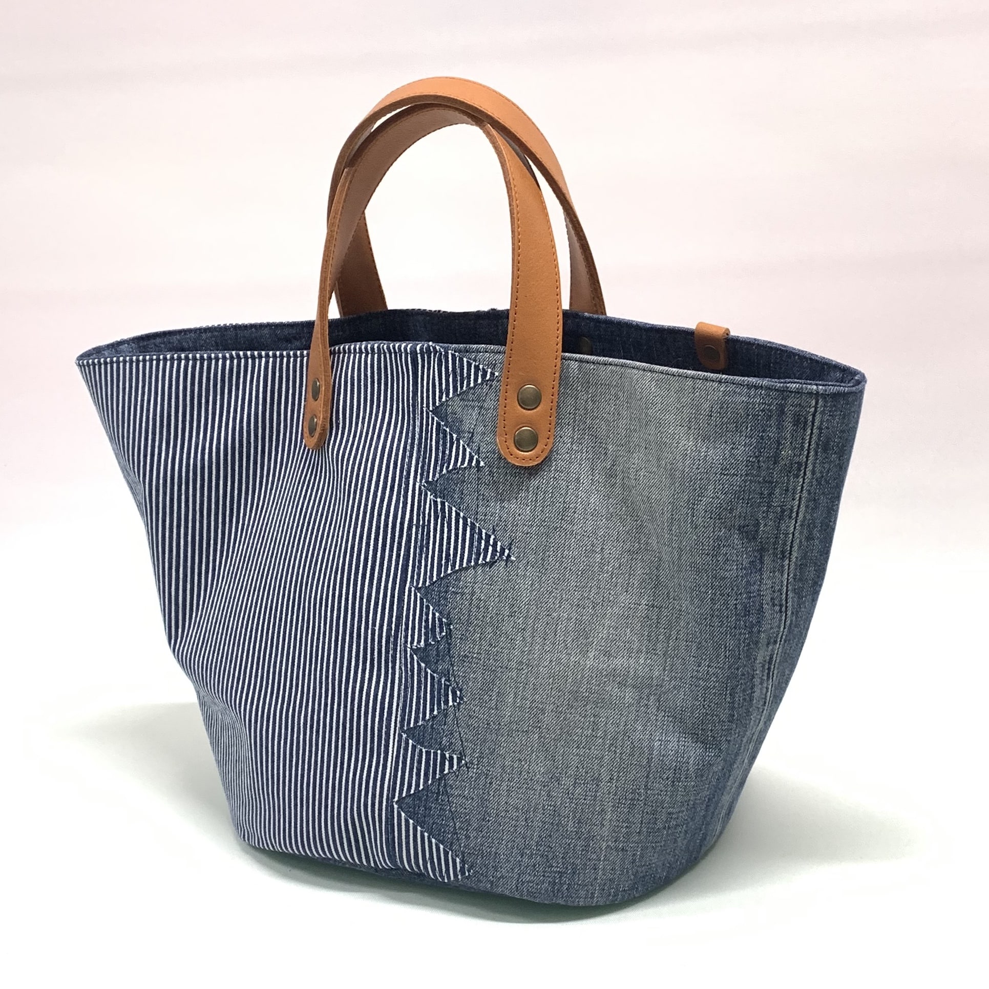 ●素材 外装:デニム、牛本革(持ち手) 内装:デニム+綿ツイル 内ポケット1、マグネットホック1